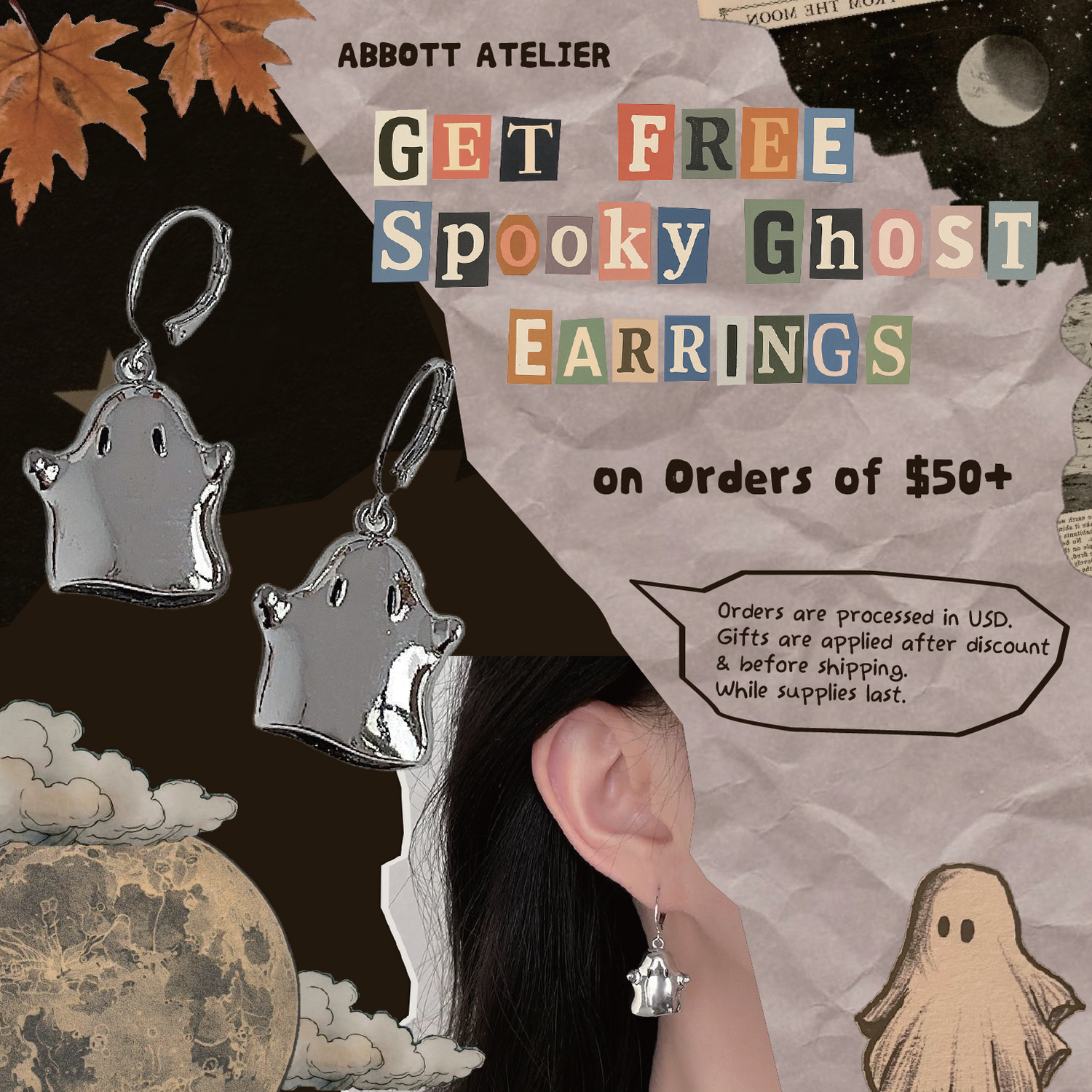 Get a free pair of Spooky Ghost Earrings with any purchase of $50+!*